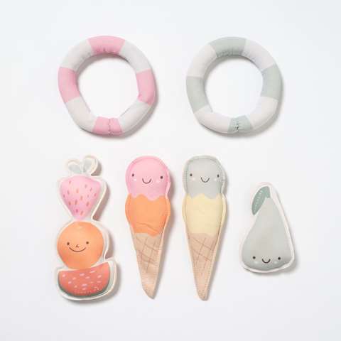 Set of 6. In the shape of ice creams, fruit and poolrings.
