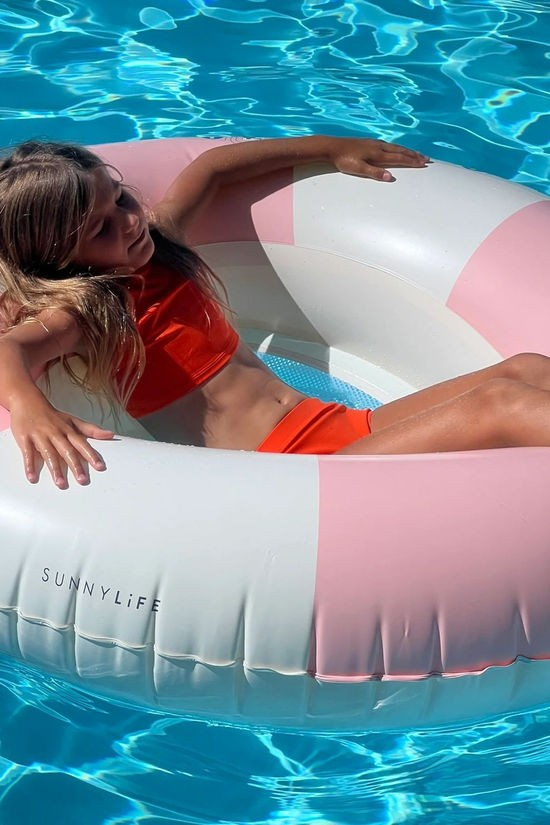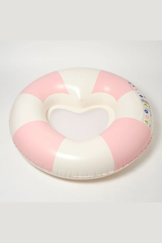 pink-and-white striped pool ring from Sunnylife with heart-shaped mesh inside.