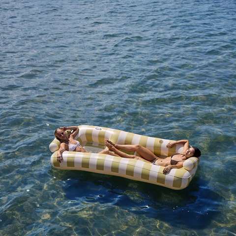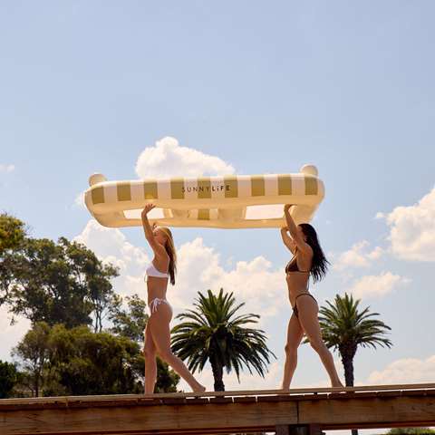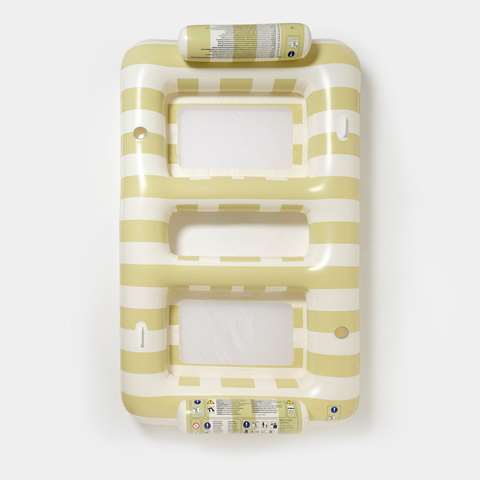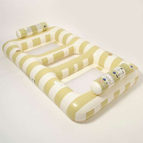 Relax in style on your pool with The Vacay Luxe Twin Hammock Float from Sunnylife. The hammock float is perfect for floating in the pool and during long balmy days at sea. Designed for two to enjoy, with a mesh interior and an inflatable tube on the outside so you are partially submerged in the water. The mustard and cream maxi stripe print completes the picture.