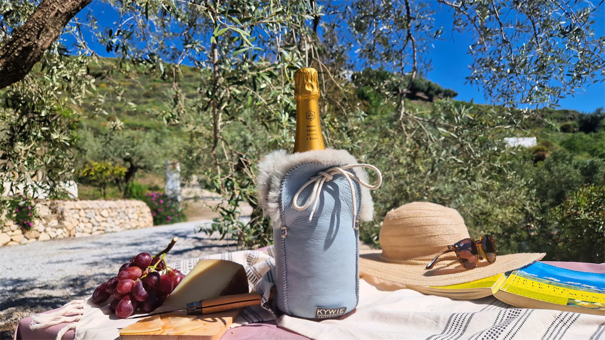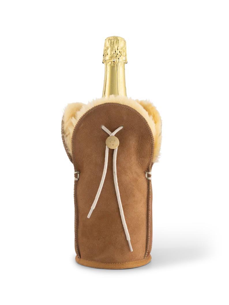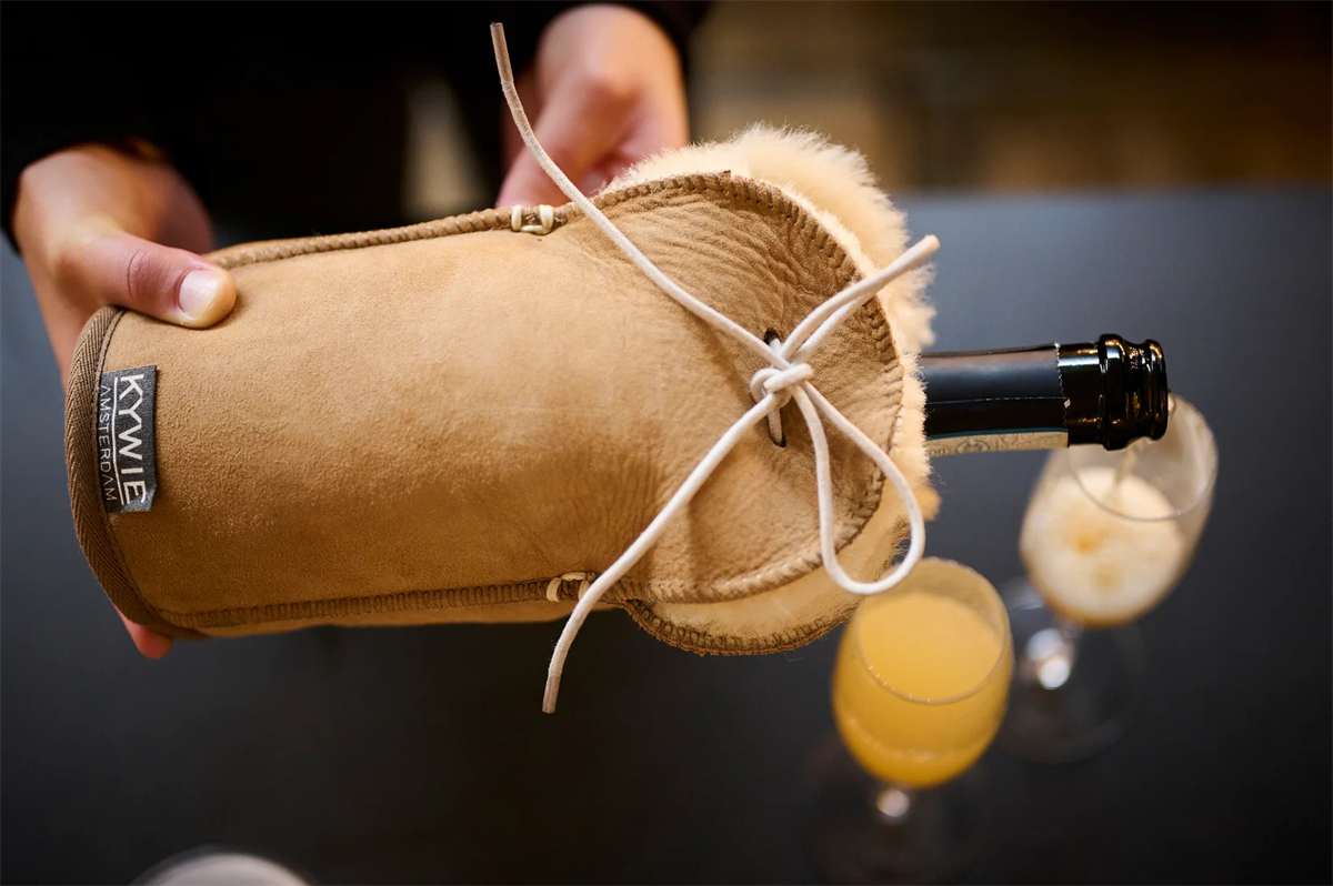Ontdek de Kywie passieve champagnekoeler, handgemaakt van 100% natuurlijke schapenvacht. De uitzonderlijke isolatie van wol en de afsluitkoord houden je champagne en wijn urenlang koel. Een uniek cadeau, een leuke blikvanger op elke tafel en rond elk zwembad.