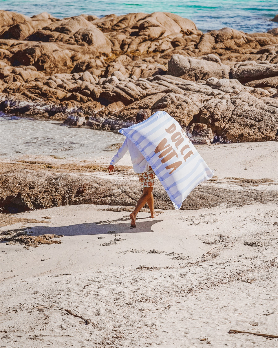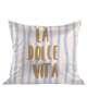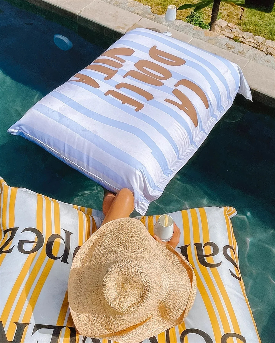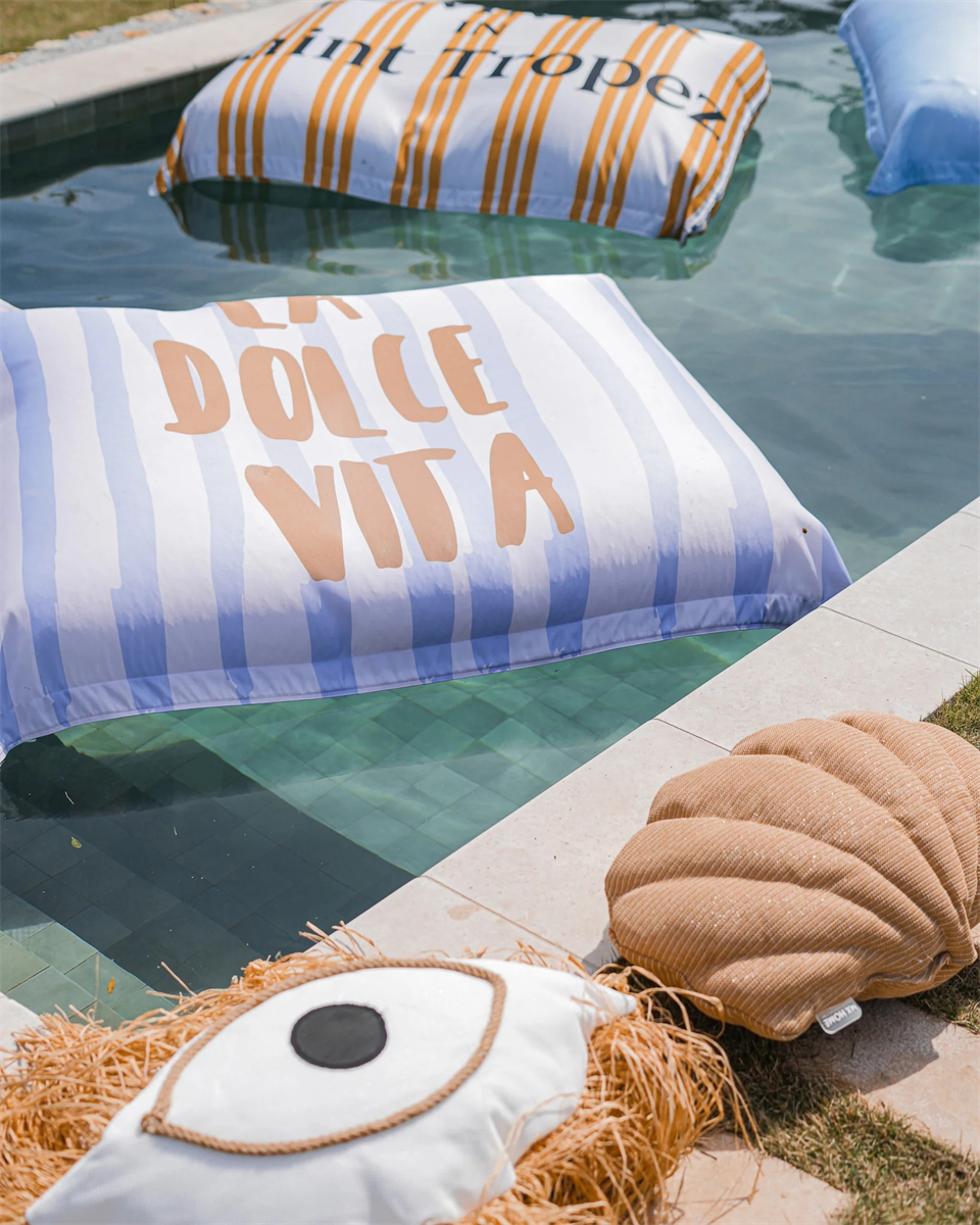 De drijvende XL pouf met opschrift Dolce Vita tovert je zwembad om tot een zomerse loungeplek met een knipoog naar de Riviera.
