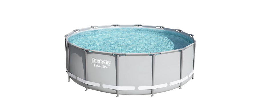 Het Bestway Power steel opzetzwembad is lichtgrijs van kleur. De buizen van het frame zijn lichtgrijs van kleur. De horizontale buizen van het frame hebben een ronde vorm.