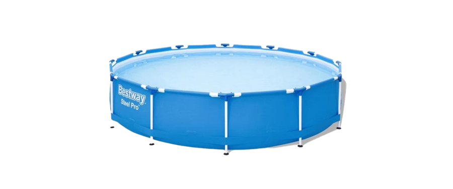 Het Bestway Steel pro opzetzwembad is blauw van kleur. De buizen van het frame zijn wit van kleur. De horizontale buizen hebben een ronde vorm en worden aan elkaar gezet met blauwe tussenstukken.