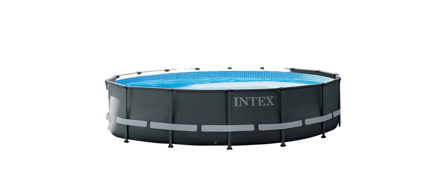Het Intex ultra frame opzetzwembad is donkergrijs van kleur. De buizen van het frame zijn grijs van kleur. De horizontale buizen van het frame hebben een ovalen vorm.
